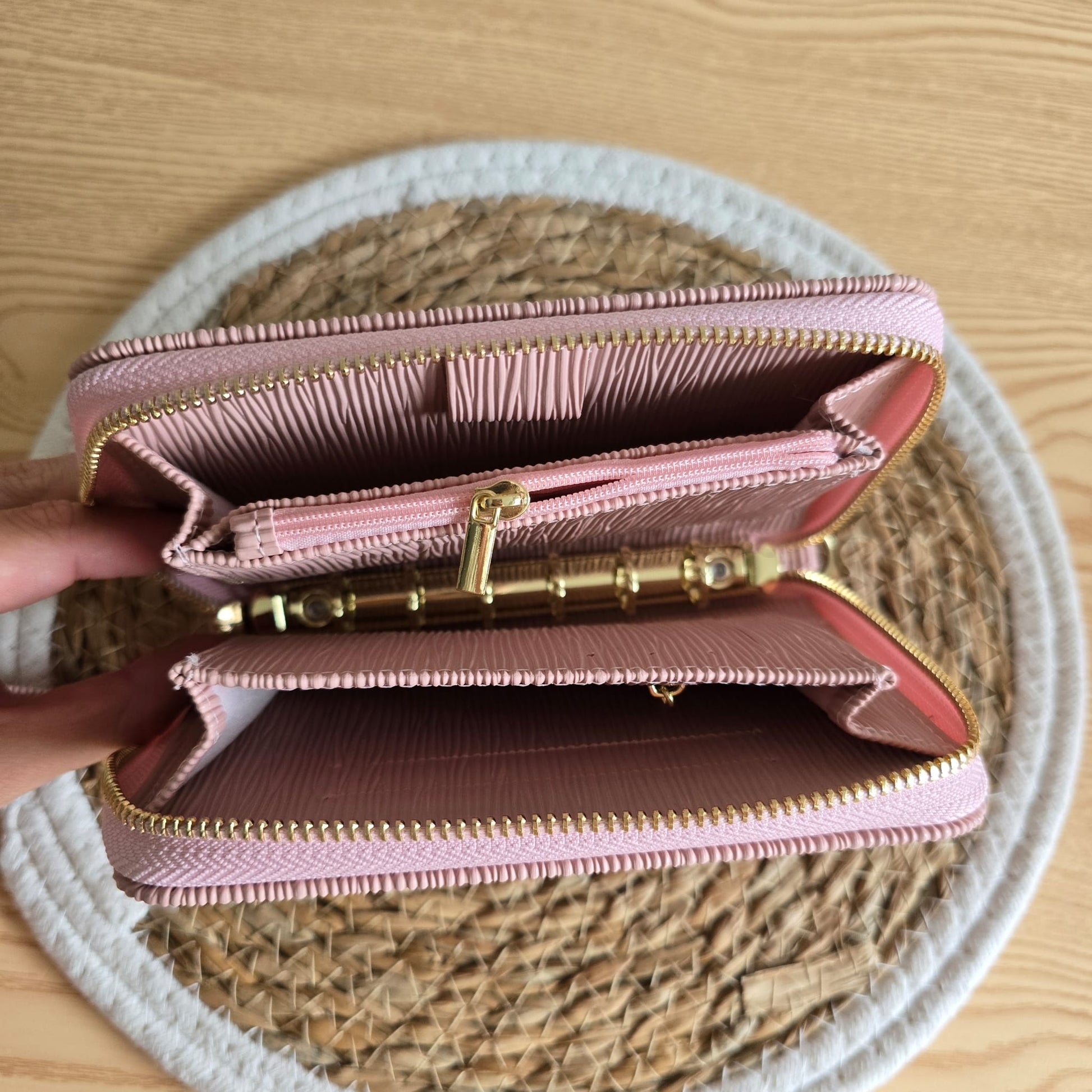 Deze Luxe premium binder heeft een mooie prachtige ribbel print en is van premium materiaal. Hij heeft een mooie gouden ringband van 1,5mm. Deze sluit met een ritssluiting. Er zitten voldoende opbergvakjes in voor pasjes en ritssluitingen voor kleingeld waardoor je deze ook gemakkelijk kan gebruiken als portemonnee. Deze binder is A7 formaat en hierin passen de A7 bindermapjes.