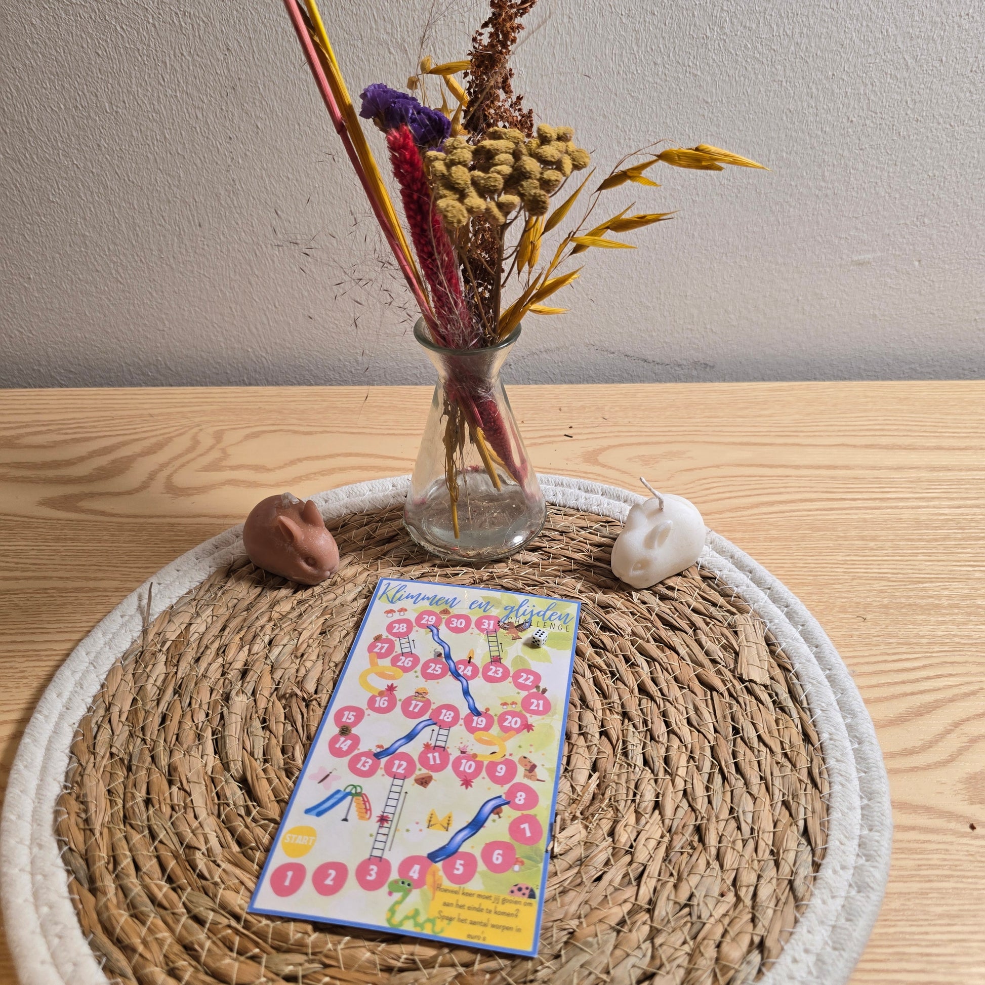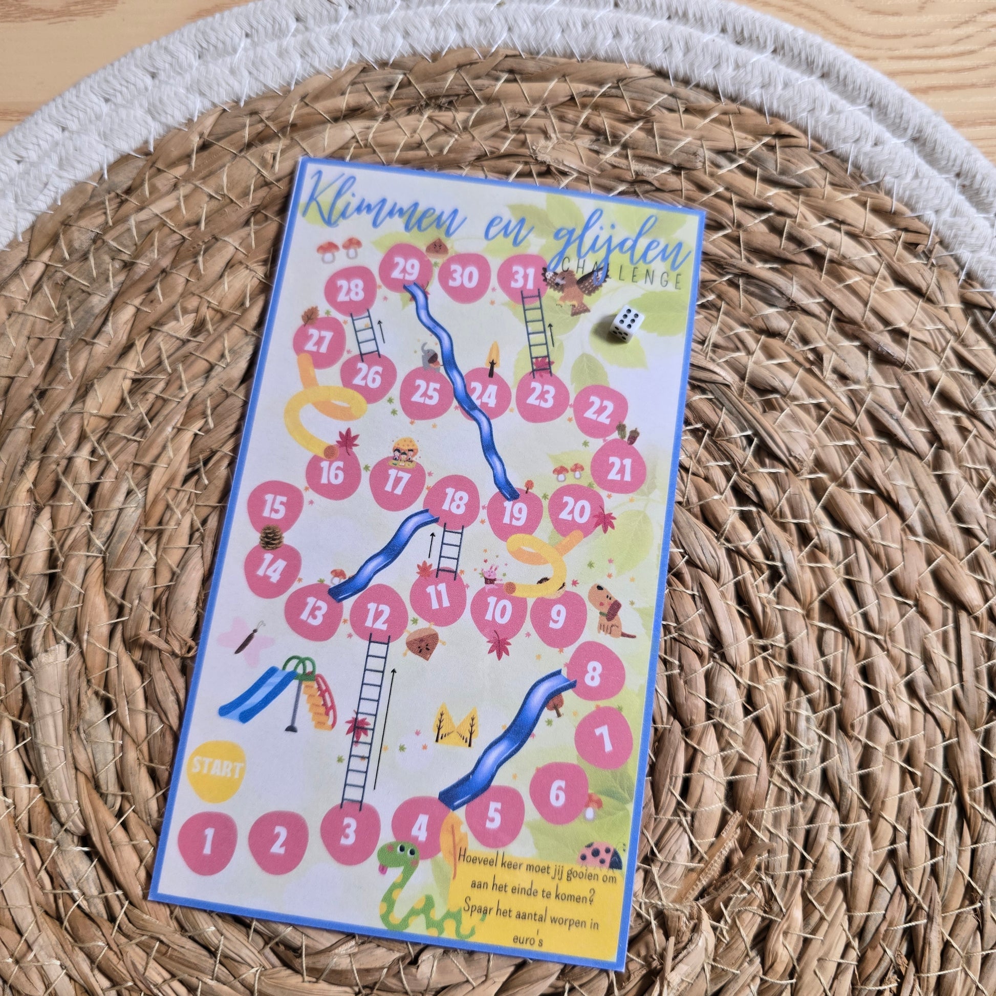 Een challenge gebasseerd op het bordspel ganzenbord of snakes and ladders in het Engels. Hoe vaak werp jij de dobbelsteen voordat je top bereikt? Spaar dit bedrag.