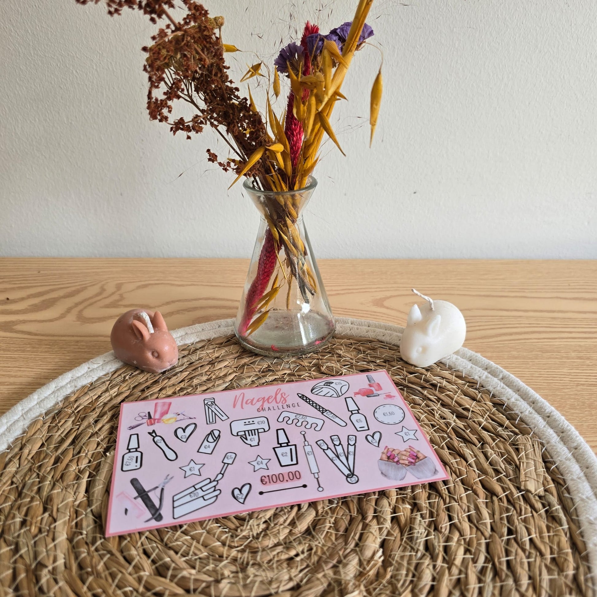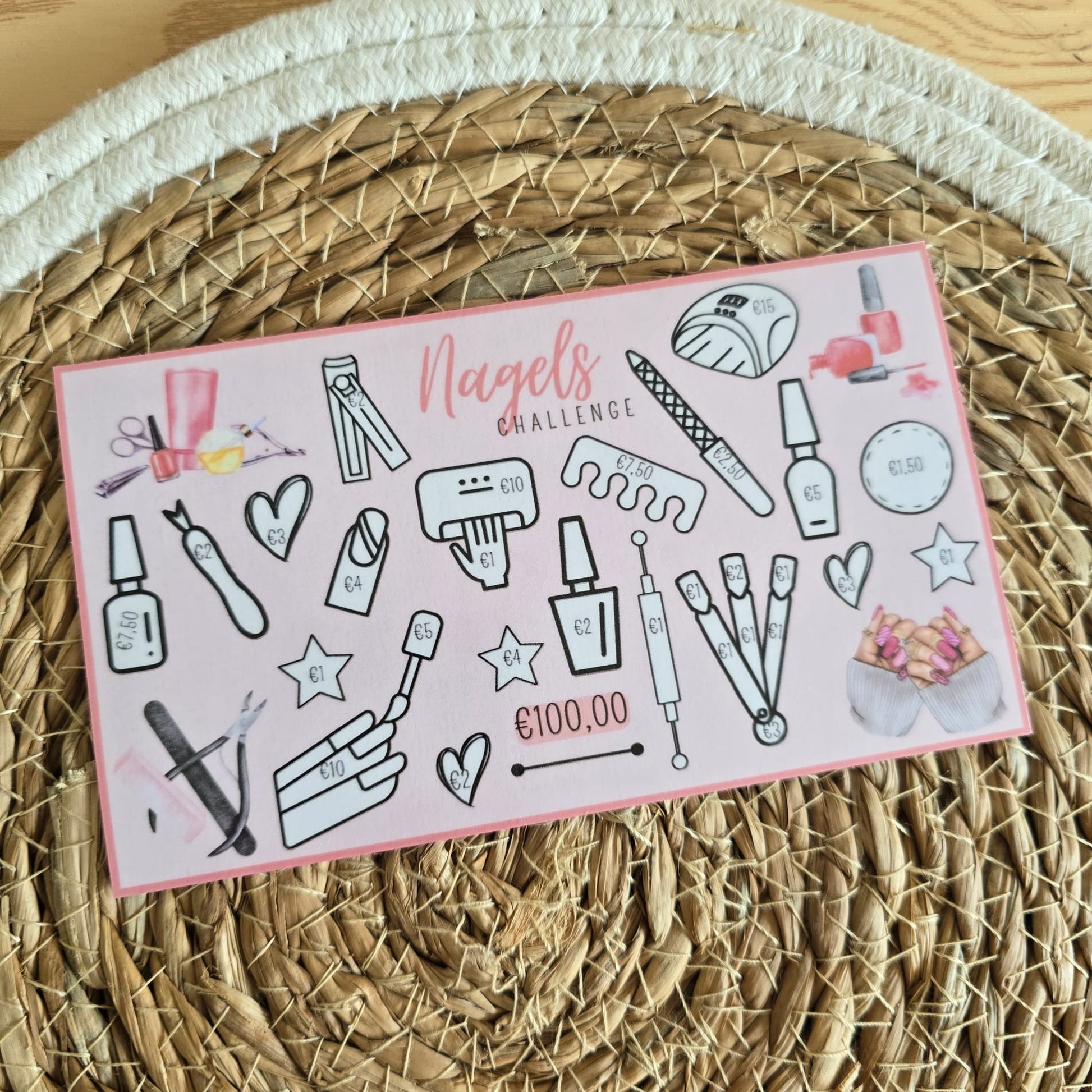 Mooie nagels. Tegenwoordig gebruiken veel vrouwen biapt, gel of acylnagels om mooi verzorgde nagels te hebben. Met deze challenge spaar je voor je prachtige nagels. Zo kun je iedere keer als je de challenge vol hebt een nieuwe set laten zetten óf deze laten vullen.