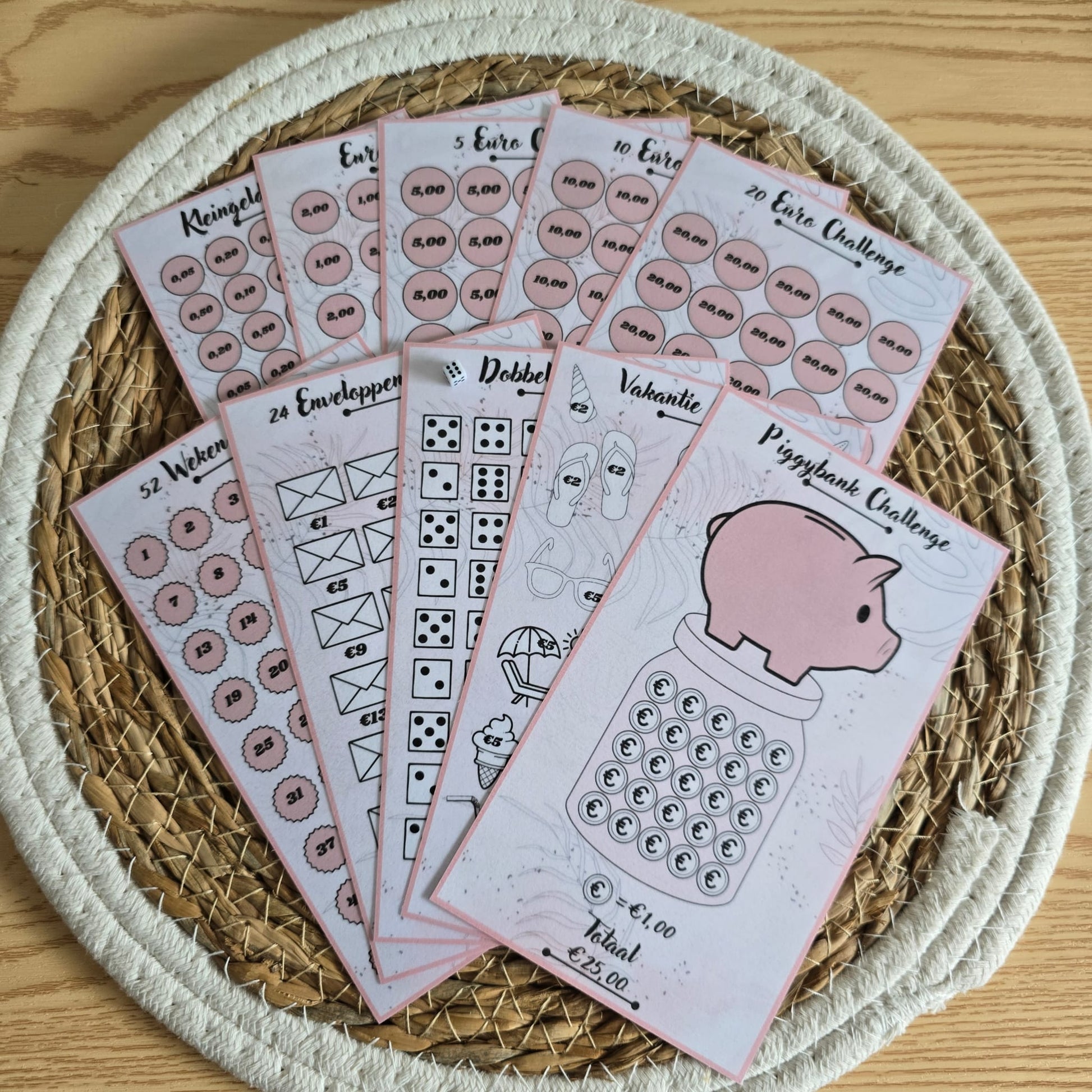 Dit is een set van 10 verschillende challenges bestaande uit een spelletje, enveloppen challenge, weken challenge, een spaarpot challenge en een challenge voor een specifiek doel, vakantie. Deze set is verkrijgbaar in verschillende kleuren dus voor ieder wat wils.