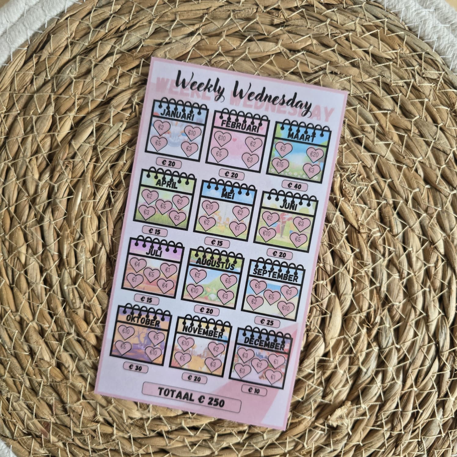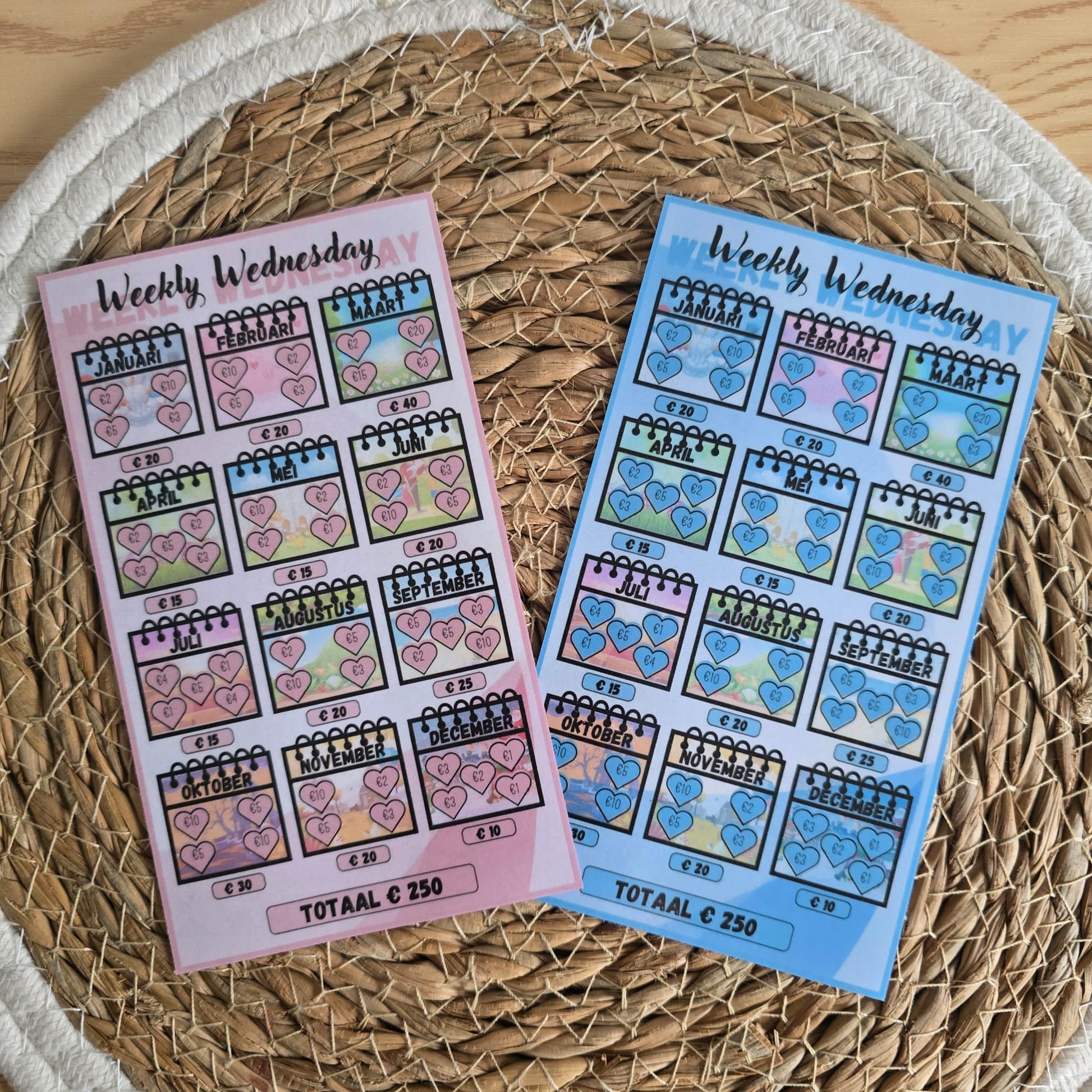 Velen kennen deze als de Saving Sunday of de Saving Friday. Ik heb een andere variant gemaakt om te sparen op de woensdag, de Weekly Wednesday. Met deze challenge spaar je iedere week op woensdag een bedrag weg en dan heb je aan het einde van het jaar een leuk bedrag gespaard van €250.